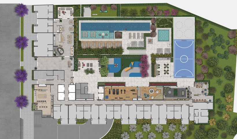 1 Portaria 2 Acesso social 3 Lobby 4 Praça da chegada 5 Fitness 6 Playground 7 Brinquedoteca 8 Churrasqueira 9 Salão de jogos 10 Coworking 11 Quadra recreativa 12 Piscina infantil 13 Piscina adulto 25 metros 14 Deck molhado 15 Solarium 16 Pet place 17 Salão de festas 18 Lounge festas 19 Lavanderia 20 Minimarket.