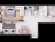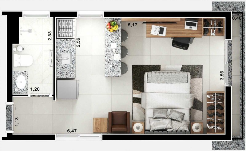 Studio, banheiro copa/cozinha, sala/quarto, varanda. 30 m2 area util.
