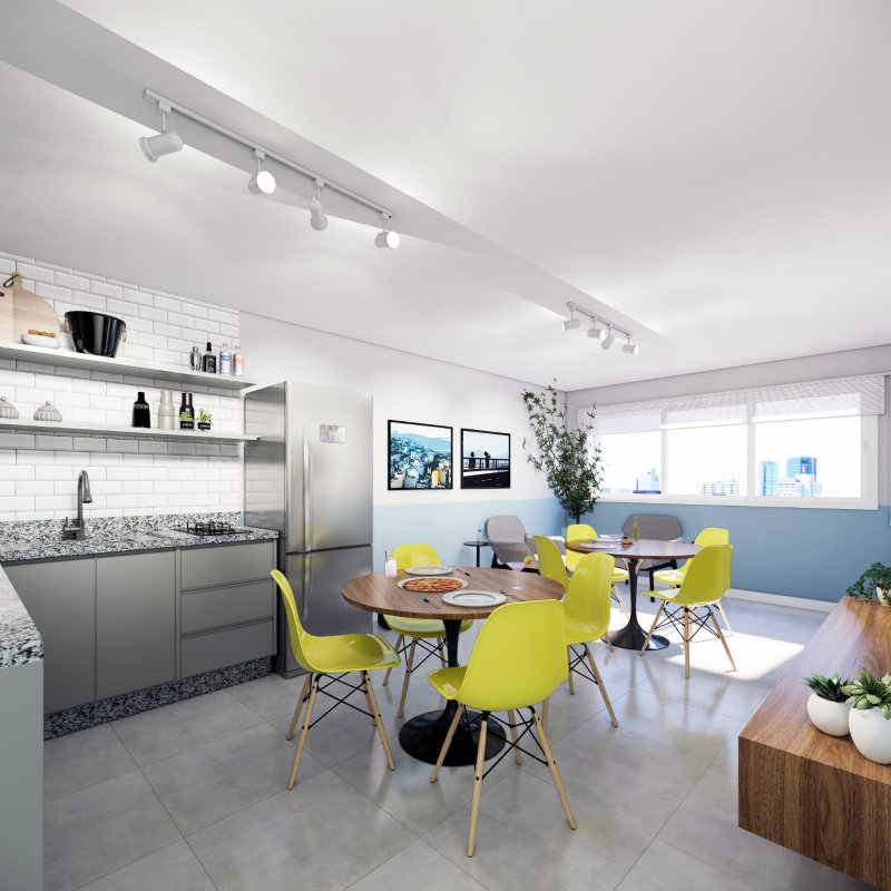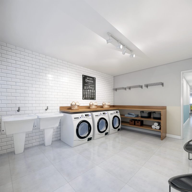 Vagas individuais, 1 por apto, p motos/bykes. 1 vaga PNE carga e decarga; 10 aptos c 1 qto, banheiro, copa/cozinha, sala, varanda c 46 m2 area util, 20,34 m2 área comum. 5° andar, Espaco Gourmet, Lavanderia Comunitaria, banheiro PNE todos entregue montados. Condominio ~ 300, IPTU 100. 5 Studios 30 m2.