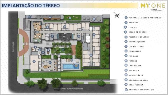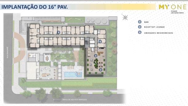 1- T O T A L D E U N I D A D E S : 343 R e s i d e n c i a i s : 3 0 0 F l a t s ( n R ) : 4 1 L o j a s ( n R 1 - 3 ) : 0 2 N º D E P A V I M E N T O S : T é r r e o + 1 6 p a v i m e n t o s , s e n d o : T é r r e o : L o j a 0 2 | L o b b y + U n i d a d e s r e s i d e n c i a i s | L a z e r 1 ° pav . : L o j a 0 1 | U n i d a d e s F l a t s 2 ° pav . : U n i d a d e s F l a t s 3 ° a o 1 6 ° P a v s . : U n i d a d e s r e s i d e n c i a i s | L a z e r ( 1 6 º pav ) P R O D U T O : R e s i d e n c i a l R 2 V : • 2 8 u n i d a d e s - 02 D o r m . - 3 8 m ² • 2 0 u n i d a d e s - 01 D o r m . - 2 4 à 2 5 m ² R e s i d e n c i a l H I S : • 2 5 2 u n i d a d e s - 01 D o r m . - 2 4 à 2 5 m ² F l a t s ( n R ) • 3 8 u n i d a d e s - S t u d i o s - 2 4 à 2 5 m ² • 0 3 u n i d a d e s - 01 d o r m . - 3 8 m ² L o j a 0 1 ( a c e s s o A v . C o r i f e u A . M a r q u e s ) - 2 6 8 , 0 0 m ² ( p e r m u t a ) L o j a 0 2 ( a c e s s o R . P a n g a r é ) - 7 1 , 6 5 m . Dispositivos economizadores de água e energia nas áreas comuns; - Sensor de presença para iluminação nos andares tipo; - Previsão de Sistema de Reuso; - Alvenaria estrutural. - Piscina descoberta com solarium; - Portaria com área para delivery; - Áreas comuns entregues equipadas e decoradas by ONE.Piso laminado na sala e nos dormitórios; - Bacia entregue com sistema de acionamento duplo - maior economia de água; - Previsão de ar condicionado (carga no quadro); - Porta balcão para o terraço no estar; - Infra para tanque e MLR nas unidades de 01 e 02 dormitórios ambos residenciais, unidades a partir de 190 mil .