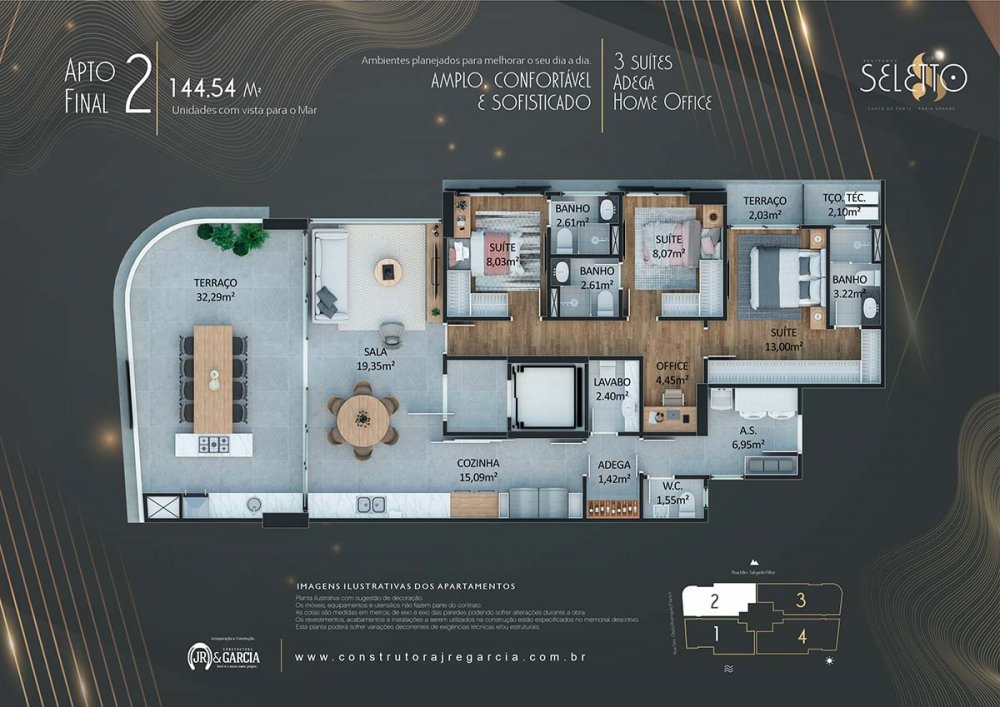 Apartamentos de 3 dormitórios, com 3 suítes, com 144,54m² a 182,48m² de área útil, sendo sala e terraço integrado, elevadores privativos, espaço adega, ambiente para home office e suíte master.